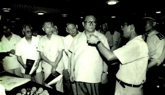 时任中共中央总书记江泽民视察佛山照明,时任公司董事长兼总经理钟信才同志向江泽民总书记汇报公司现状与发展前景。