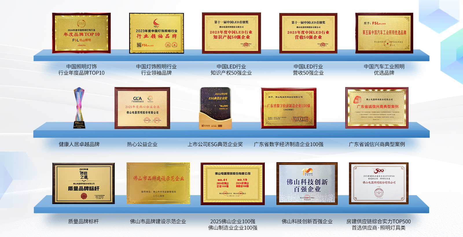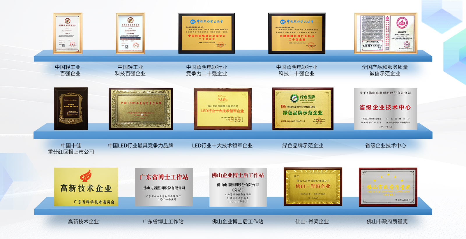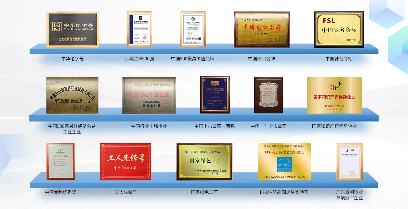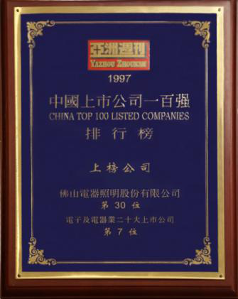 佛山照明入选“中国的脊梁”国有企业500强,被深交所评为1995年度综合业绩“十佳上市公司”排行第一名。