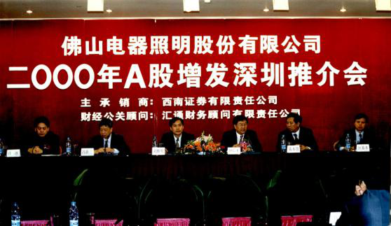 在南海务庄基地建设70条普泡生产线,年产普泡4亿只,是当时国内最大的白炽灯生产基地;当年11月在深交所成功上市,是国内照明行业首批上市公司。